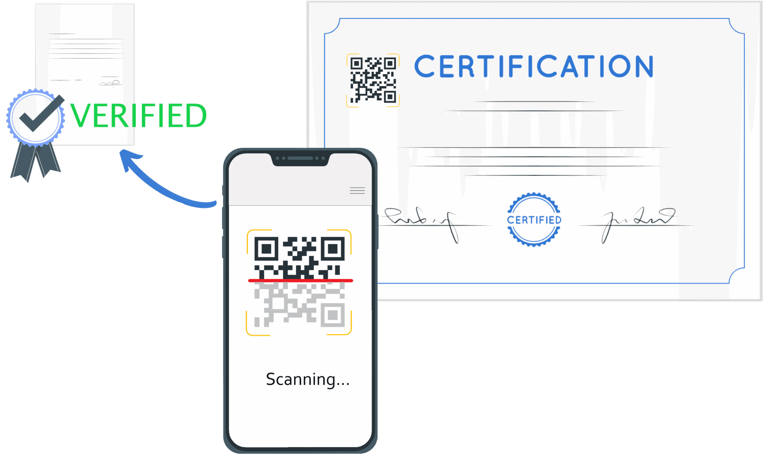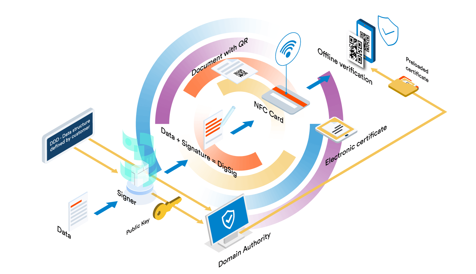 Issuance and verification of documents using DigSig technology ensures that data is digitally signed and is protected against counterfeiting. DigSigs conform to the international standard ISO/IEC 20248 and the data within the QR code is structured in a special way and secured by asymmetric encryption, making it highly secure. Since all the data is held within the code itself, verification of the document can be done by any smartphone with or without an internet connection making it possible in any situation.